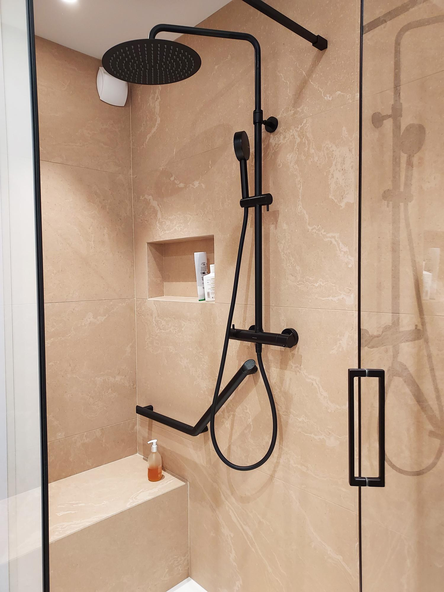 A présent, le volume accueille l’espace douche théâtralisé. Conçu comme un écrin dédié au bien-être, cet espace intègre un banc et s’habille avec douceur et naturel d’un carrelage chaleureux de terres mêlées.