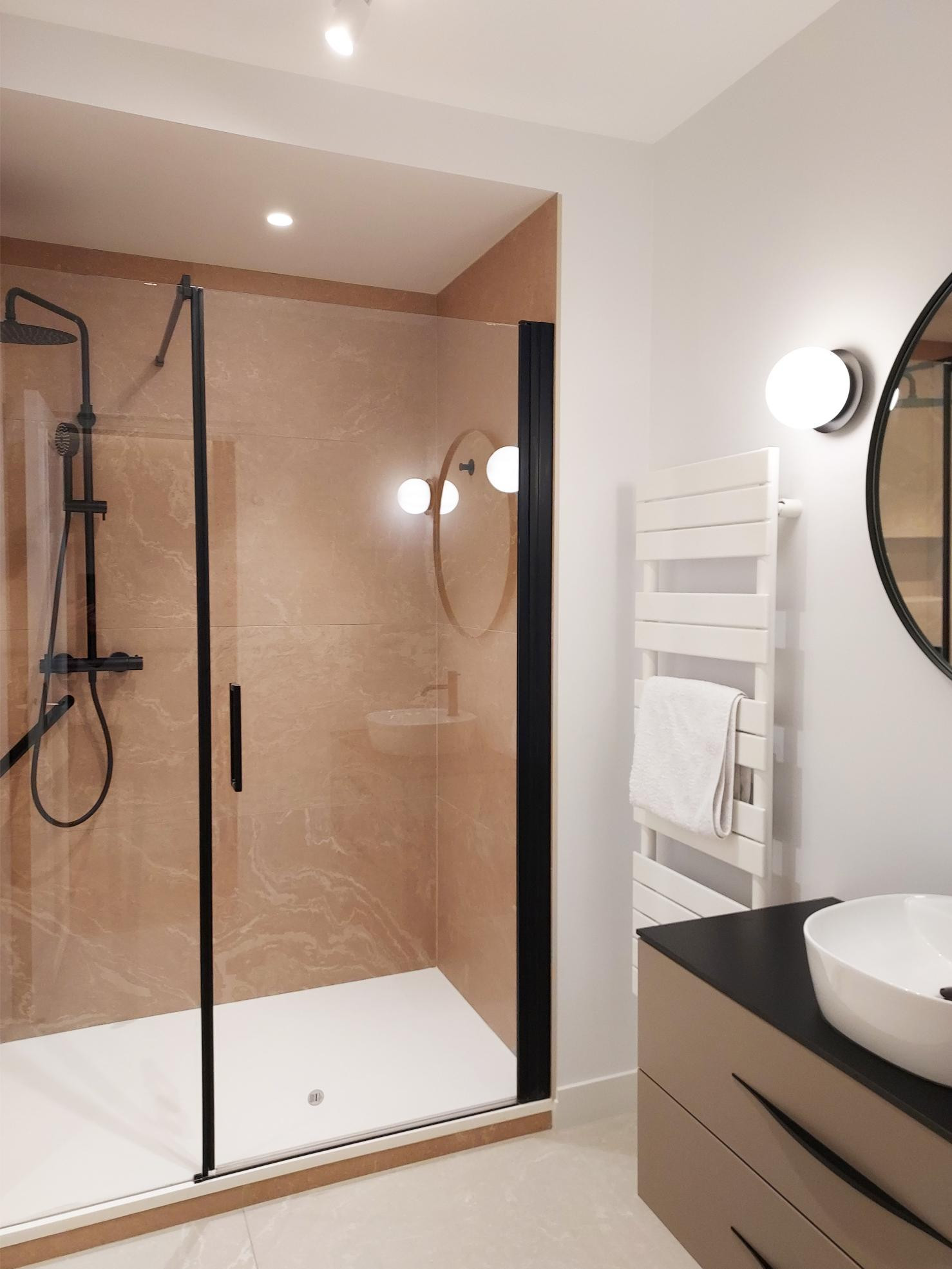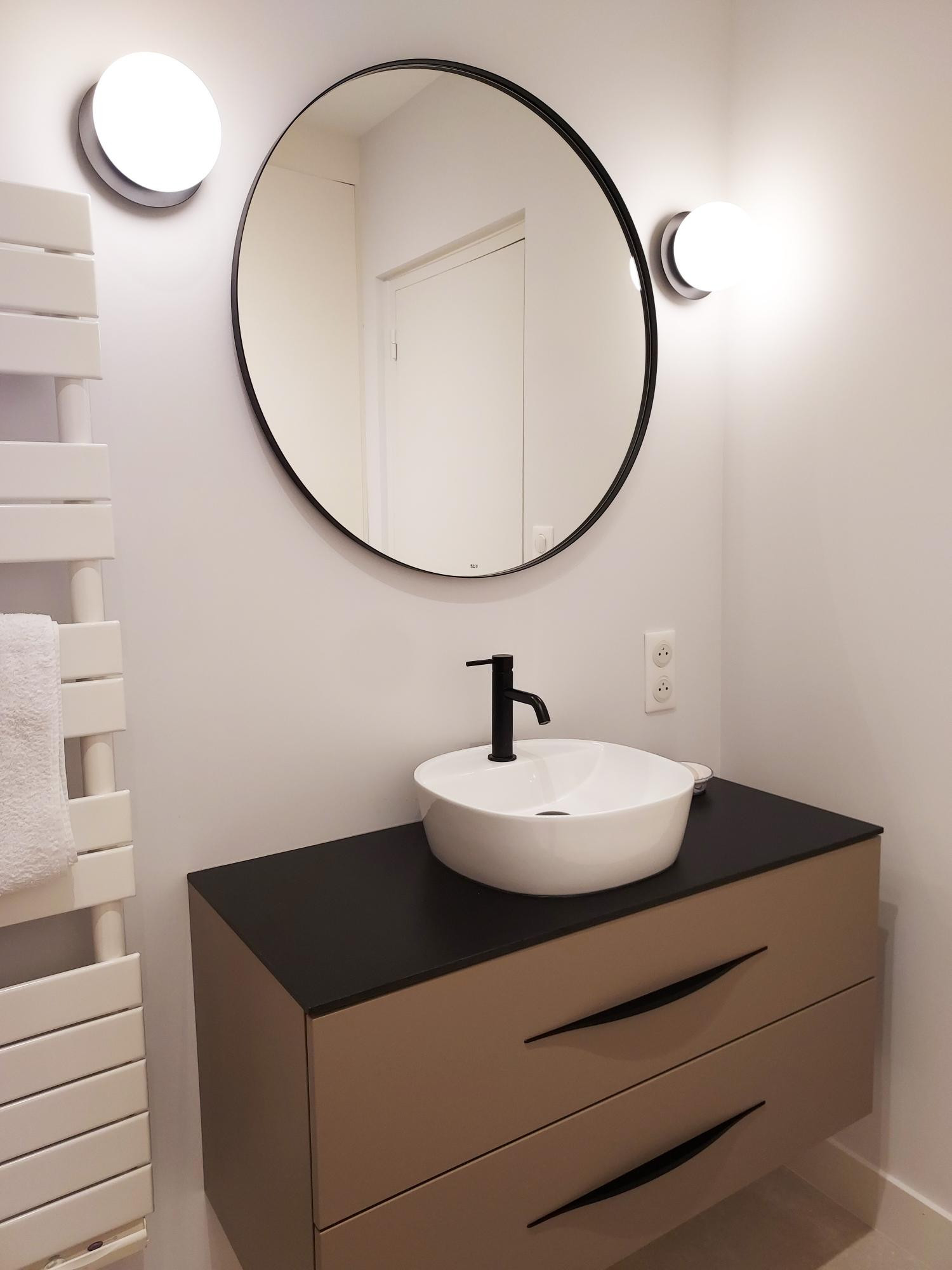 L’espace vasque est sobre avec son grand miroir rond et 2 appliques en verre opalin.
