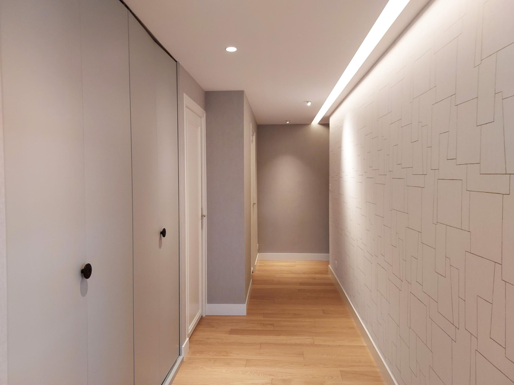 Aux murs, un effet fil à fil légèrement métallisé se décline en 2 teintes unies et avec un motif à la sophistication délicate qui enveloppe l’entrée et la pièce de vie.