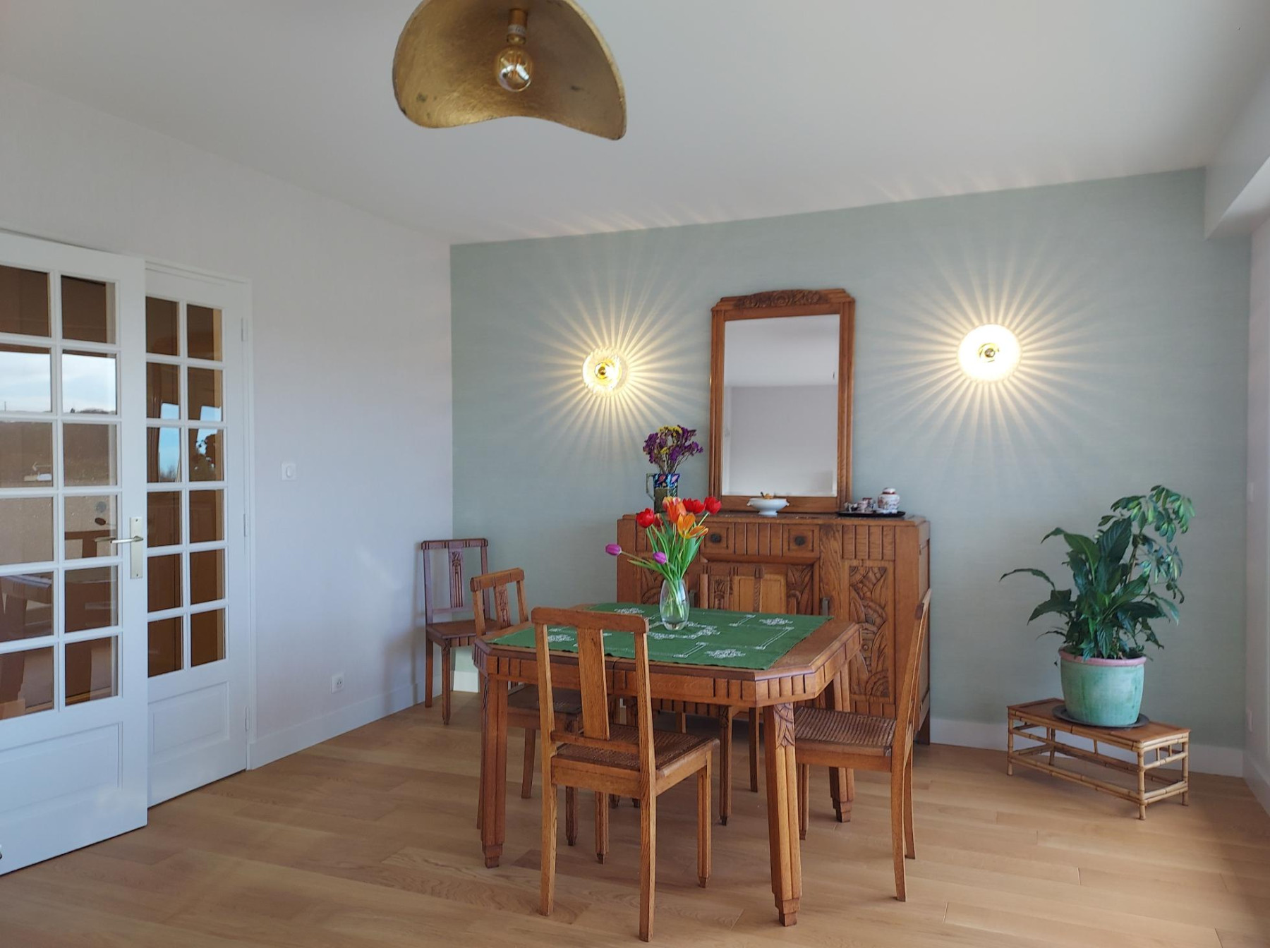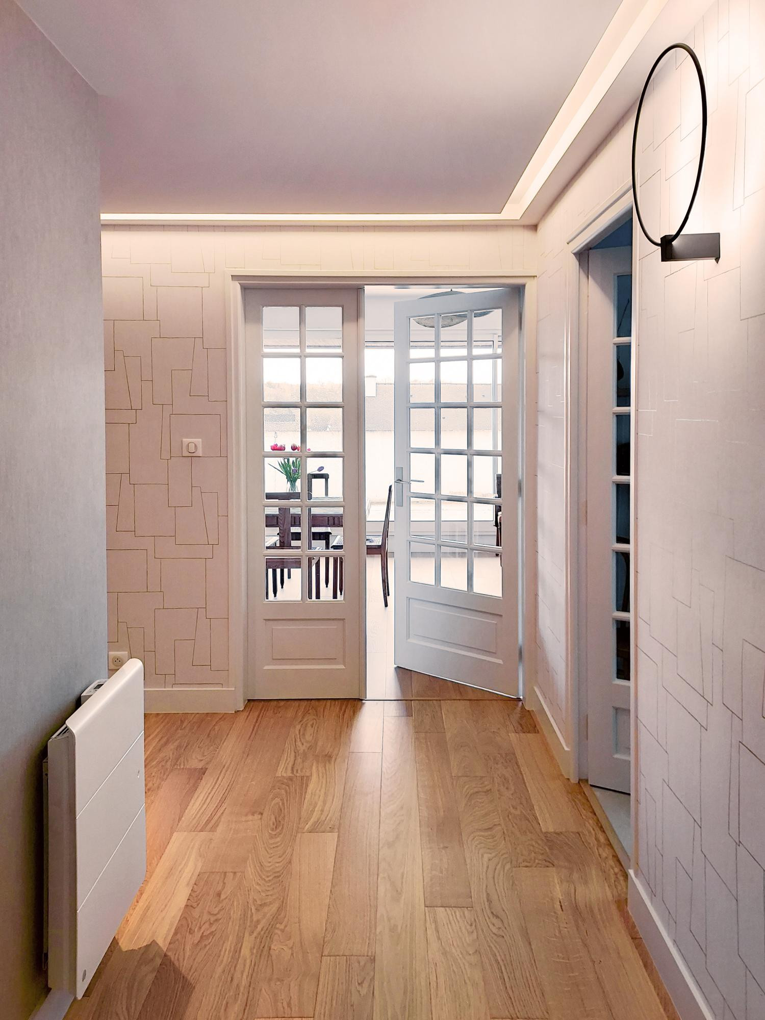 Dans cet espace de vie, le travail réalisé a principalement porté sur les matières. La double-porte de communication est conservée et repeinte en blanc craie pour gagner en modernité.