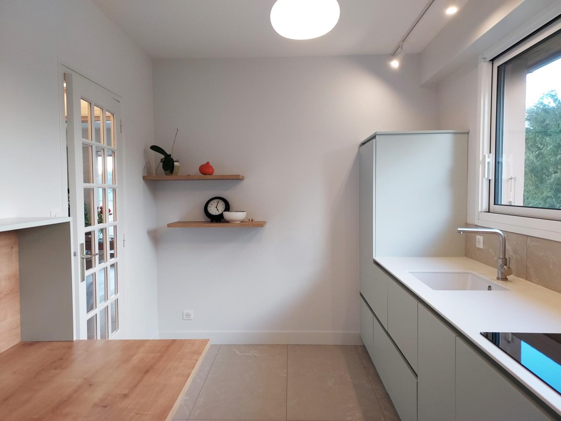 Les façades de cuisine sont dans une teinte délicate « brume » avec le toucher soyeux de la laque mate. Le plan de travail est en céramique blanche unie et la crédence comme le sol en grands carreaux de carrelage de terres mêlées blanc et grège.