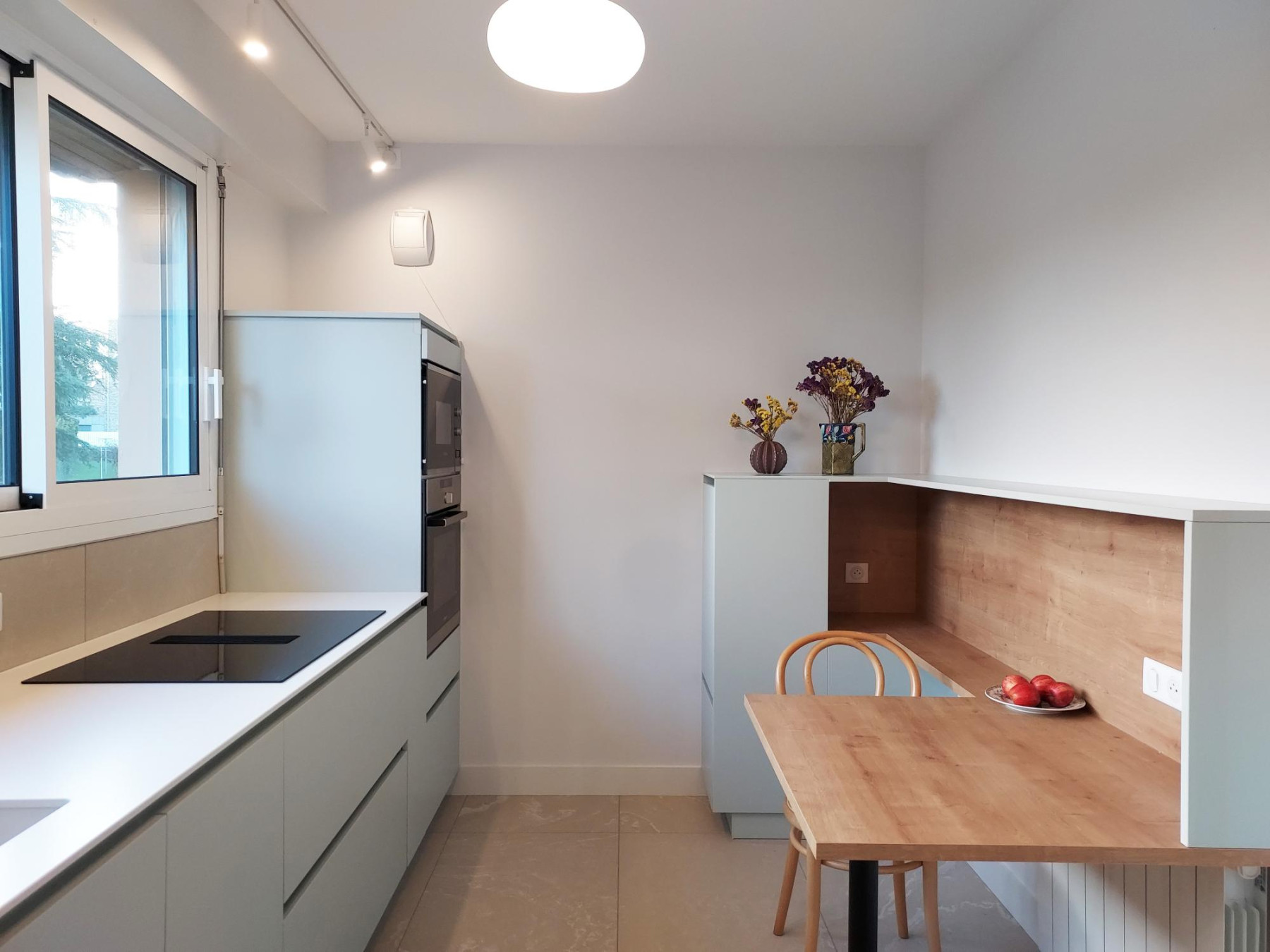 Vaste et lumineuse avec une splendide vue panoramique sur les arbres, la disposition du plan de travail coule de source. Il s’installe le long de la fenêtre et les éléments hauts (frigo et fours) en symétrie dans les angles.